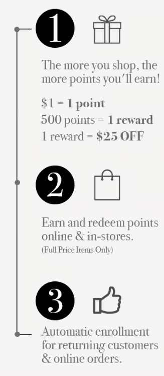 Earn One Point per $1 Spent On All Regular Price Purchases, Earn 500 Points to gain One Reward.